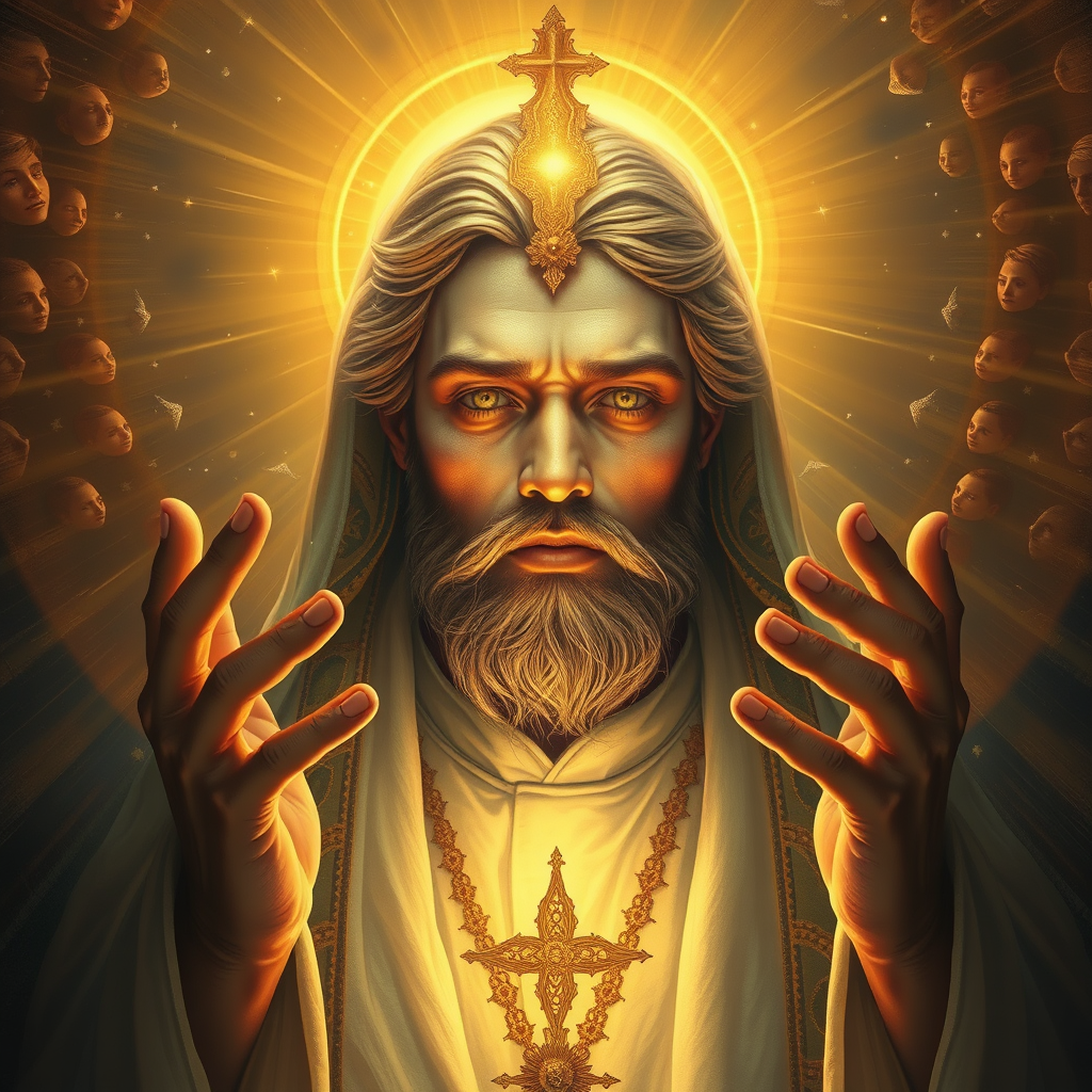 mksks style full portrait of a sacred priest bathed in holy light with ultra quality and stunning visuals. The image captures intricate details and perfect anatomy, showcasing a magical ambiance. The priest has a beautiful face framed in golden colors, exuding a divine aura. The canvas is vividly detailed with a touch of surrealism, where muted and unique colors blend harmoniously. While maintaining an ethereal quality, small whimsical elements appear like abstract hands and faces subtly woven into the scene, giving a sense of wonder and curiosity. The artwork, reminiscent of a dream, balances beauty with hints of the surreal, inviting the viewer into an otherworldly experience.