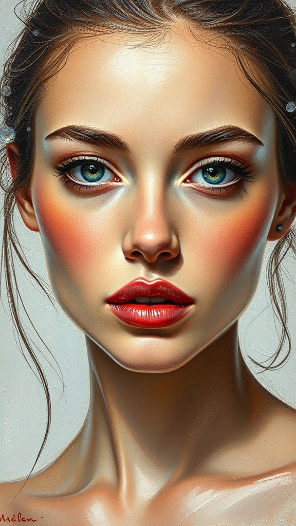 View this AI-generated image featuring model delicate impressionist impasto brush strokes flawless composition exquisite face soft rim lighting captivating character portrait simple background intricate detail oil on canvas outstanding craftsmanship highly detailed 4k clarity. Created using advanced