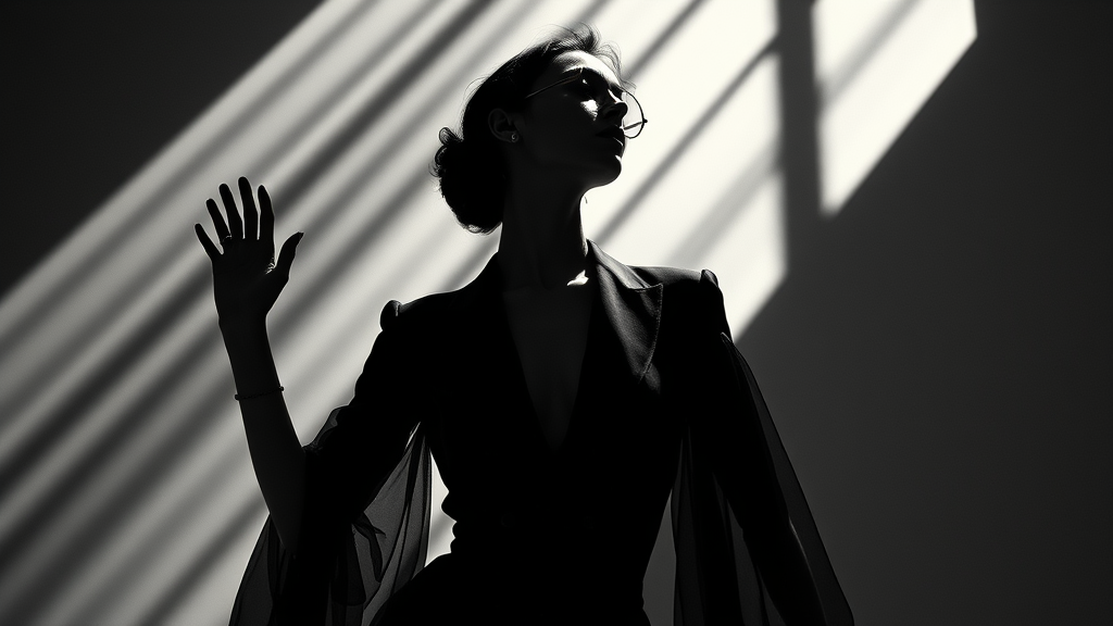 Model fashion photography inspired by Lillian Bassman, utilizing dimensional light and full symmetry, capturing the essence of whole body imagery with a touch of Serge Lutens' style, evoking elegance with a modern twist and slight vintage allure.