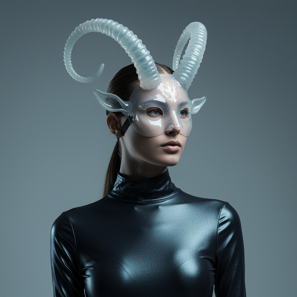 A female model gracefully dons a sleek, obsidian leotard crafted from a satin-like techno-fiber, radiating a striking metallic luster. Her hair is fashioned into a precise low ponytail, underscoring the minimalist, futuristic vibe of her ensemble. Her defining accessory is a translucent mask, artfully sculpted into the form of a Capricorn's head, with gracefully arched, curved horns. This mask, made from a smooth, detailed silicone-like material, allows her facial features to subtly emerge, seamlessly blending reality and illusion to elevate the avant-garde, cyberpunk-inspired style with a touch of biomimicry. Set against a soft, cool-toned slate gray background, the overall color palette is subtly icy, casting the model in stark relief within a futuristic, conceptual fashion photography or experimental art scene.