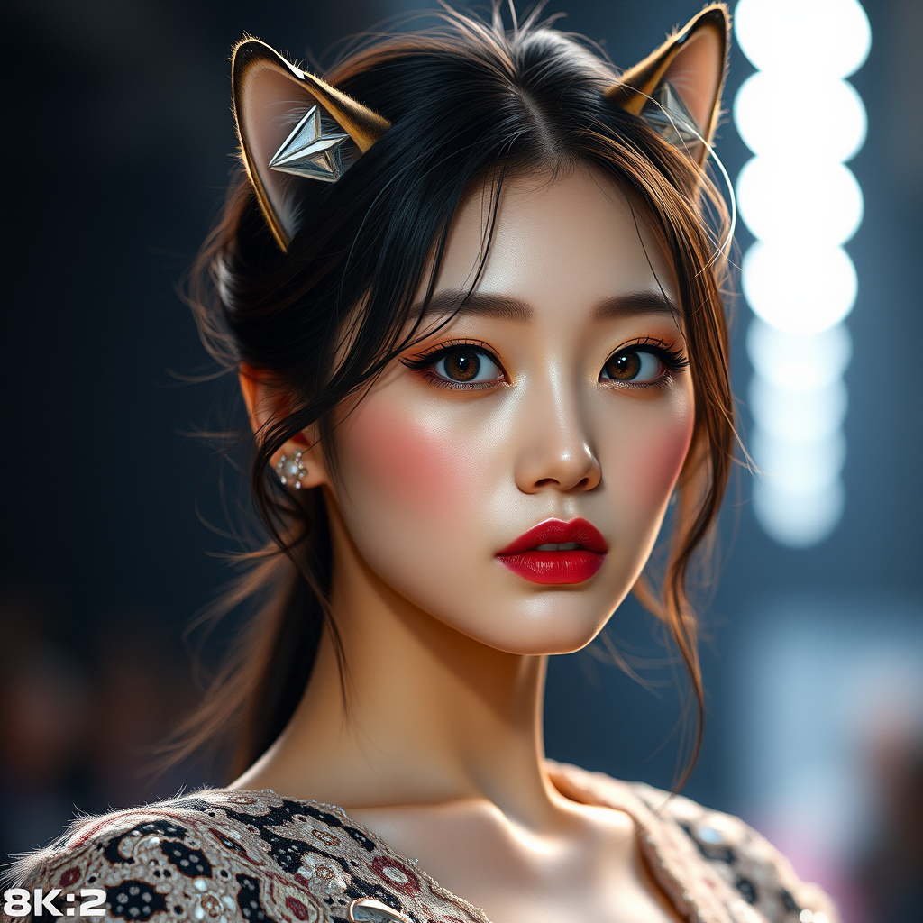 Model shoot, beautiful Korean woman, K-pop idol, featuring symmetrical eyes, ultra-high resolution, photorealistic imagery, 8k detail, hyperrealism with dramatic lighting, photography showcasing a cat strutting down the runway, shot at f/2.0. The scene includes elements of CGI and 3D art, with an emphasis on octane rendering. Blending cartoon, anime, and illustration styles, the image captures digital art and digital painting. Avoid elements like low quality, jpeg artifacts, duplication, or any signs of disfigurement, ensuring correct anatomy and proportions, keeping the composition intact.