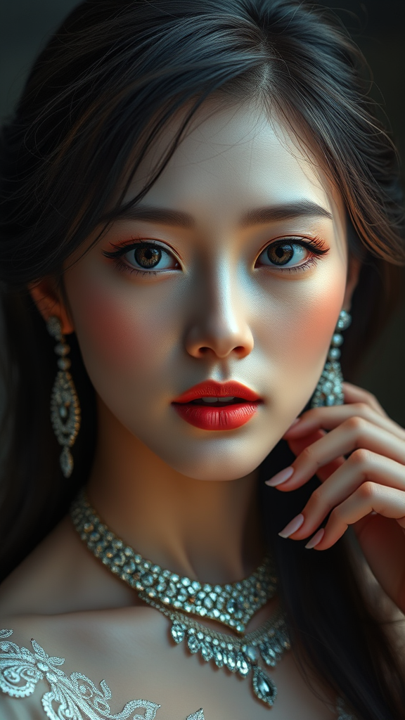 Model shoot, beautiful Korean woman, K-pop idol, symmetrical eyes, ultra high resolution, photorealistic, 8k, hyperrealism, dramatic lighting, photography, f/2 aperture, elegant jewelry, CGI elements, 3D influences, doll-like perfection, octane render style, with hints of cartoon and anime charm, illustration and digital artistry, avoid low-res issues, steering clear of text errors, ensuring quality and avoiding jpeg artifacts, maintaining aesthetic appeal, eliminate duplicates, avoiding morbid or mutilated depictions, centered framing, natural fingers and hands, face well-proportioned, no mutations, clear and well-defined imagery, hydration evident, focus on accurate anatomy and proportions, no extra limbs or disfigurations, well-formed structure, natural limb count, realistic and proportional features.