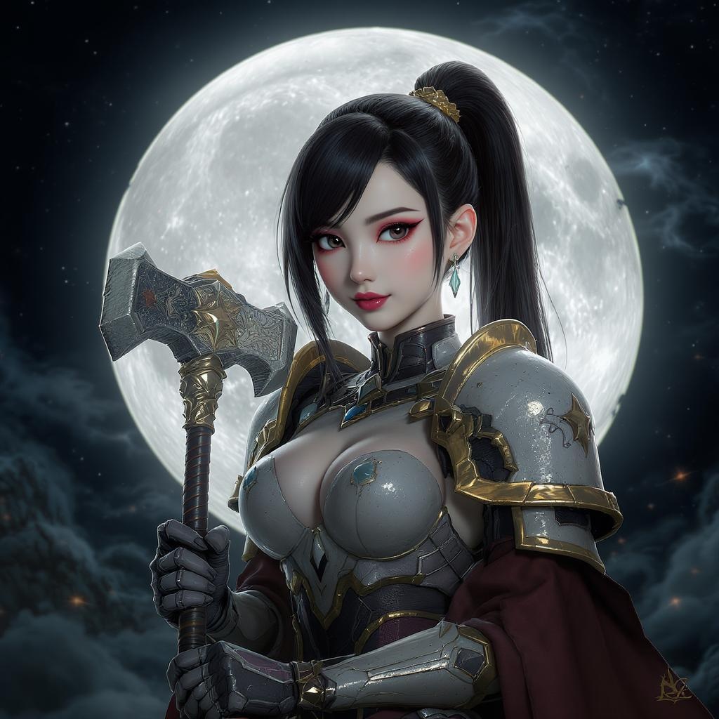 A stunning modelshoot featuring a single girl with a face reminiscent of Tifa Lockhart, beautifully crafted in an armored ensemble adorned with intricate gems inspired by the Warhammer 40k and Adepta Sororitas designs. Her highly detailed face glows with a subtle blush and pink eyeshadow, complementing her elegant ponytail hairstyle. This fashion portrait showcases her standing confidently against the backdrop of a full moon, illuminated by cinematic lighting. Her ensemble is completed with an ornate and intricate warhammer, embodying a perfect blend of strength and grace. The scene is enhanced by a chiaroscuro effect, highlighting her features amidst the shadows. Designed with the precision of ulzzang-6500, the image captures the essence of high fashion while maintaining a touch of fantasy. Canvas-framed with a 3D cartoonish flair, the vibrant yet harmonious colors bring the portrait to life, emphasizing the character's striking presence. The overall composition is meticulously crafted to avoid any odd proportions or distortions, ensuring a flawless and captivating visual narrative.