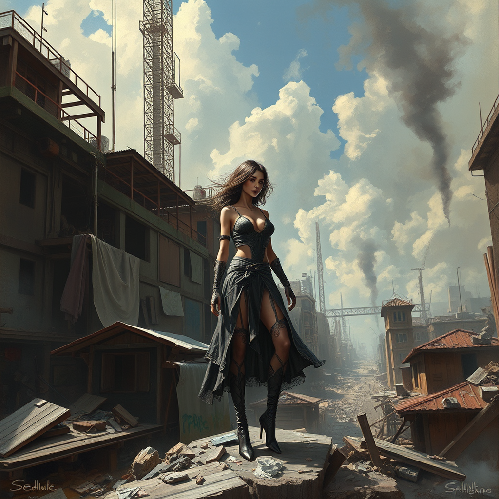 Modelshoot style, a full-body photo depicting the most exquisite artwork, featuring a detailed female post-apocalyptic figure amidst a ravaged cityscape. This masterpiece is crafted with the elegance of an oil painting by Ed Blinkey, Atey Ghailan, and infused with the enchanting touch of Studio Ghibli. The artistry echoes the style of Jeremy Mann, Greg Manchess, and Antonio Moro, making waves on ArtStation and CGSociety. Intricate and high-detail with sharp focus, this dramatic, photorealistic work blurs the lines between reality and imagination through the eyes of midjourney artists and Greg Rutkowski. With creative elements like disconnected limbs and ethereal qualities, this artwork possesses an intentional out-of-frame aesthetic. Despite a hint of low resolution and abstract text, it captures attention with unexpected gross proportions. The painting, reminiscent of video game graphics and 3D rendered tiling, showcases a unique blend of Photoshop artistry, ensuring it stands as a testament to creativity amid chaos.