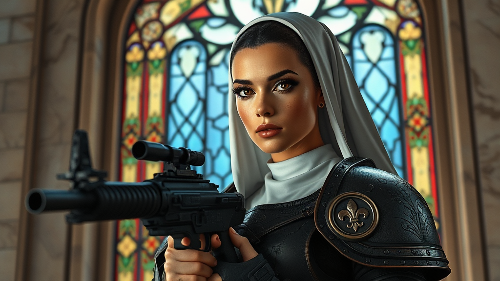 Modelshoot Style, a full shot of a strikingly beautiful woman, imagined as a Sister of Battle, stands with a bolt rifle in front of an ornate stained glass window. Her skin has a warm tan, adorned with a delicate fleur de lys tattoo on her face. Her armor is embellished with wax seals, showcasing intricate designs reminiscent of sci-fi religious iconography, typical of Warhammer 40k style. Her face is perfectly symmetrical, with reflective eyes, dark eyebrows, and tastefully applied mascara complementing her makeup. She wears a formidable yet elegant sci-fi nun armor. The scene is set against marble walls, with dust particles dancing in the air. The lighting is detailed and dramatic, using rim and chiaroscuro techniques to enhance the atmosphere. The composition evokes the style of a majestic, professional impressionist oil painting, drawing inspiration from artists like Waterhouse, John Constable, and modern influences from Ed Blinkey, Atey Ghailan, and Studio Ghibli. The piece is highly detailed and intricate, trending on platforms like ArtStation and CGSociety, embodying the graceful storytelling of Makoto Shinkai's Kyoto.