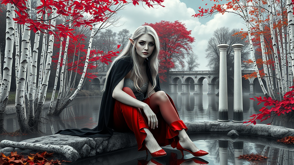 Modelshoot style black and white photo of a stunning elven woman sitting beside a pond in a forest, featuring high saturation, captivating beauty, blonde eyebrows, dark eyeshadow with reflective eyes, and skillful makeup. Rim lighting highlights her dramatic chiaroscuro effect. She wears a striking red cloth, high heels, and a black cape. White trees, birch with white bark, and Roman arches stretch across the background, with red and yellow leaves creating a vibrant contrast against white towers and clouds. Inspired by artists like John Constable, Ed Blinkey, Atey Ghailan, Jeremy Mann, Greg Manchess, and Antonio Moro, this image trends on ArtStation and CGSociety. The composition is intricate, highly detailed, and dramatic, capturing the essence of beauty and enchantment.