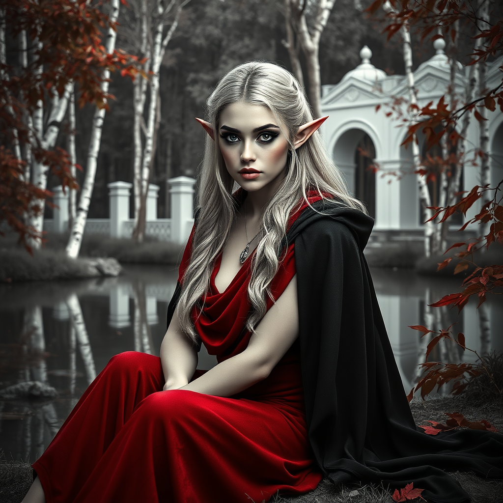 Modelshoot style, black and white photo of an enchanting elven woman sitting by a pond in the forest, showcasing high contrast and chiaroscuro lighting. She is adorned with dramatic makeup featuring reflective eyes and dark eyeshadow, framed by blonde eyebrows and sidelocks. Her attire includes a striking red cloth with a black cape, accentuating her form. The scene is enriched with Roman arches and white towers in the background, surrounded by white birch trees with red and yellow leaves. The setting, reminiscent of a John Constable painting, is detailed and intricate, reminiscent of works by Jeremy Mann and Greg Manchess. The image is trending on ArtStation and CGSociety, highlighting its artistic detail and dramatic composition.