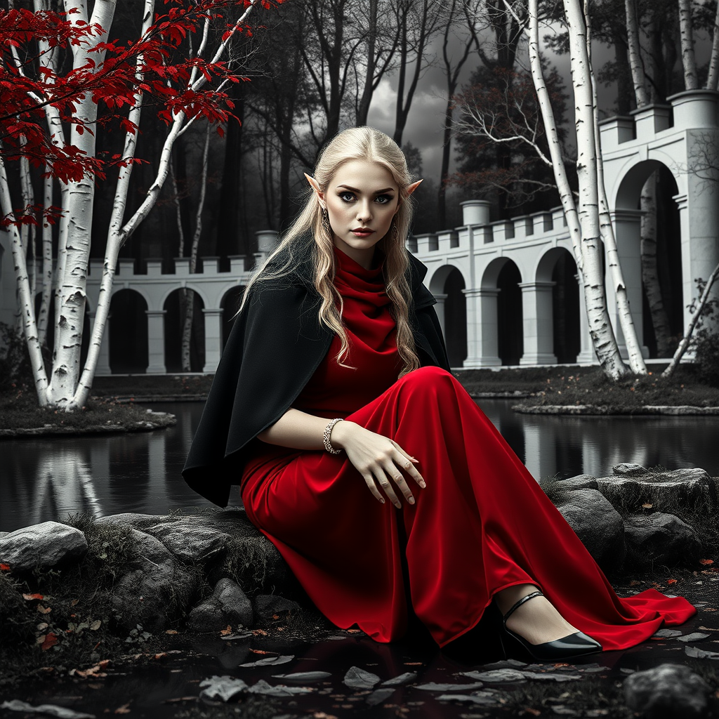 Modelshoot style black and white photo of an incredibly beautiful elven woman sitting beside a forest pond, featuring dramatic chiaroscuro lighting. Her captivating elf-like features are highlighted by dark eyeshadow and reflective eyes. She's wearing a striking red cloth and a black cape, with elegant high heels. Blonde eyebrows frame her expressive eyes. The background features white trees and roman arches, with birch trees displaying red and yellow leaves. A sense of classical beauty is evoked by the white towers and clouds, resembling artworks by John Constable and Jeremy Mann. The scene is intricate and highly detailed, inspired by trending works on ArtStation and CGSociety. The elven woman's attire is sophisticated, including a long skirt and subtle accessories, surrounded by an ambiance that's both fantastical and serene.