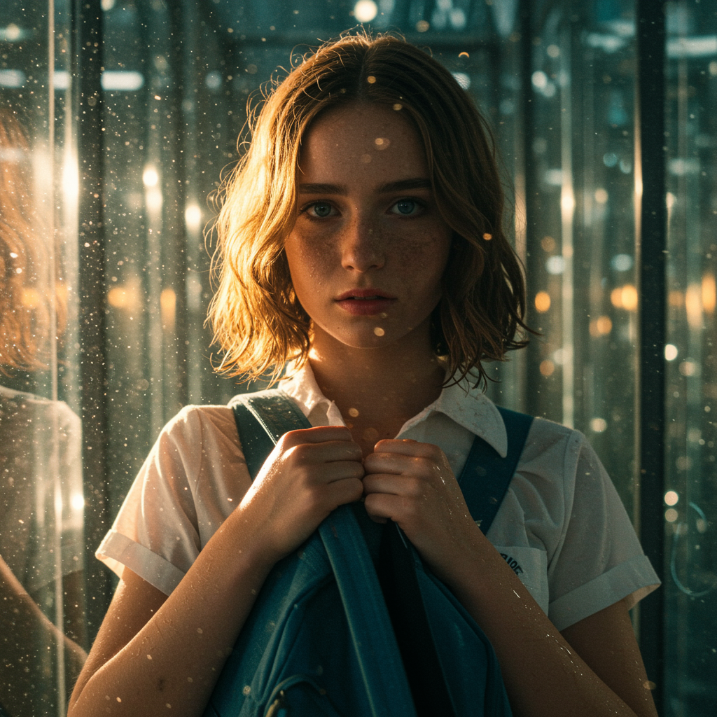 Modelshoot style with a school bag, damp and dirty elements with water droplets creating vibrant refractions and reflections. Set against a backdrop of mirrors and prisms, sunlight casts glowing lights and intricate patterns. Imagine this as a detailed oil painting with high contrast, sharp focus, and a touch of elegance and drama. The reflection of eyes seem to go on infinitely, akin to a photorealistic piece by artists like Ed Blinkey, Atey Ghailan, and Greg Manchess. The style captures the essence of works by Studio Ghibli and Alphonse Mucha while trending on platforms like ArtStation and CGSociety. Despite the intricate and high-detail focus, avoid elements like cartoonish or 3D styles and ensure harmony in anatomy and proportions, steering clear of any mutations or disfigurements, to maintain a graceful and coherent visual narrative.
