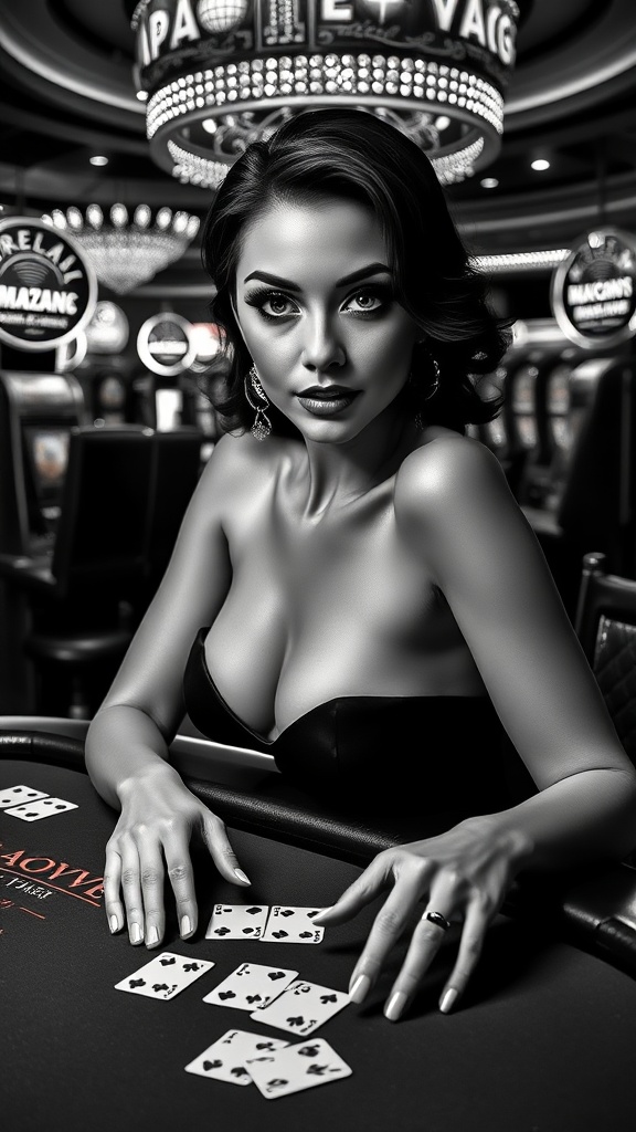 Modelshoot style full body black and white photo of an enchanting woman, exuding a femme fatale allure as she elegantly poses on a blackjack table amidst a Las Vegas casino. Her striking eyes are enhanced with mascara and dramatic makeup, reflecting a captivating intensity. Her features include a charming nose and a radiant smile, highlighted by rim lighting that creates a striking chiaroscuro effect. Surrounding her are the iconic elements of a casino: slot machines, playing cards, and the vibrant essence of Las Vegas. The scene is reminiscent of a professional, majestic impressionism oil painting influenced by artists like Waterhouse, John Constable, and Jeremy Mann. The artwork is detailed and intricate, capturing the drama and allure of the setting, trending on ArtStation and CGSociety. The image is artful yet realistic, avoiding any distortions or abstract elements like extra limbs or mutated forms, ensuring a visually stunning and cohesive representation that aligns with high-quality artistic creation.