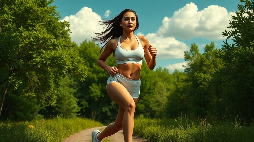 Modelshoot style full body portrait of an incredibly beautiful fitness girl jogging through a lush green forest, exuding a sense of grace and vitality. Her long hair flows behind her, accentuating her symmetrical and detailed face with reflective eyes, enhanced by a touch of mascara and makeup. Her prominent cheekbones are highlighted by dramatic, chiaroscuro lighting, creating an exquisite interplay of shadows and highlights. She wears a crisp white sports bra paired with matching white sneakers that lightly press against the forest trail. Above, white clouds dot the sky, casting a serene ambiance over the scene. Her toned legs, thighs, and calves are a testament to her fitness and dedication. The scene is rendered in an intricate, high-detail, majestic impressionism oil painting style, drawing inspiration from the works of Waterhouse, John Constable, and Studio Ghibli, as well as contemporary artists like Jeremy Mann and Greg Manchess. This artwork is trending on ArtStation and CGSociety for its blend of dramatic lighting and professional execution, capturing both the beauty of the subject and the tranquility of the setting.