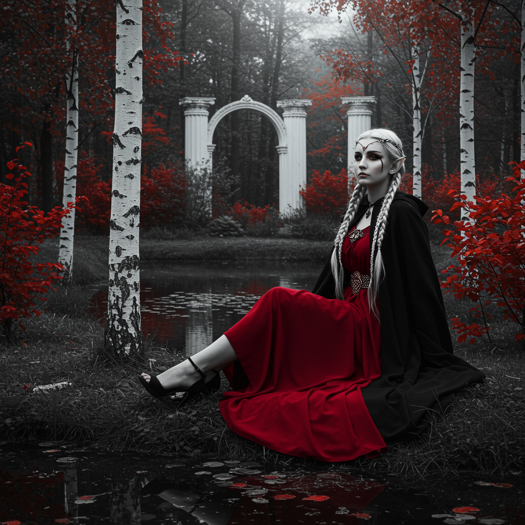 Modelshoot style full body black and white photo of an ethereal elven woman sitting gracefully by a serene forest pond, enveloped in a dramatic play of chiaroscuro lighting. Her long sidelocks frame a face accentuated with reflective eyes and dark eyeshadow, intricate makeup enhancing her delicate features. She wears a flowing red cloth and high heels contrasting with a black cape, surrounded by a picturesque scene of white bark birch trees and vibrant red and yellow foliage. Roman arches and white towers rise in the background, adding a touch of grandeur. Inspired by the styles of John Constable, Jeremy Mann, and Greg Manchess. The landscape brims with high detail and drama, fitting for an art piece trending on ArtStation and CGSociety. Her aristocratic poise and elegance are accentuated by her attire, which artfully blends classic and mythical motifs.