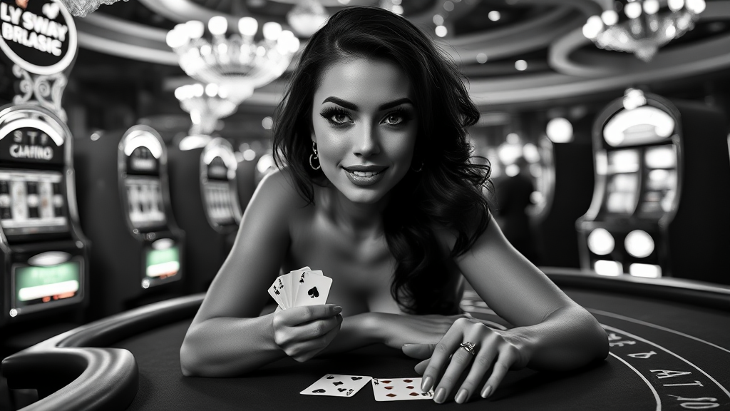 Modelshoot style full body black and white photo of a captivating femme fatale sitting on a blackjack table, adorned with mascara and reflective eyes, perfect makeup, and a cute nose, showcasing her teeth under dramatic chiaroscuro lighting. The scene is set in a glamorous Las Vegas casino, surrounded by slot machines, cards, and glowing lights. Her poised and elegant posture on the blackjack table is enhanced by the play of rim lighting. This image is akin to a professional and majestic impressionist oil painting, reminiscent of works by Waterhouse, John Constable, Ed Blinkey, Atey Ghailan, Jeremy Mann, Greg Manchess, and Antonio Moro. It trends on ArtStation and CGSociety for its intricate high detail. The scene includes tiny playing cards in a refined artistic style.