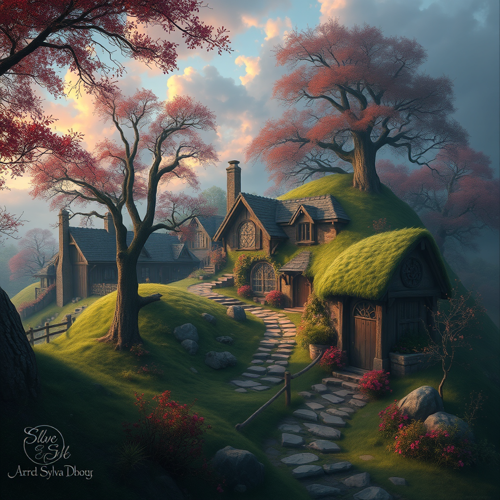 Modelshoot style, full body photo capturing a serene and beautiful hobbit's shire, rendered as a majestic oil painting by Ed Blinkey, Atey Ghailan, Studio Ghibli, Jeremy Mann, Greg Manchess, and Antonio Moro. This artwork is intricate and high detail, with sharp focus and a dramatic, photorealistic style. It embodies the magic of SylvaMagic, trending on platforms like ArtStation and CGSociety. Despite being a 3D-rendered cartoon on canvas, it harmonizes surreal colors and captures the essence of enchantment and peace found in a hobbit's world. The landscape is lush and vibrant, with a sense of depth and clarity that evokes wonder and tranquility. Avoid any mutations or disfigurations, ensuring the portrayals are natural and cohesive, highlighting masterful anatomy and proportionate figures. The emphasis is on breathtaking scenery and artistic harmony, free from any digital errors or visual distortions.
