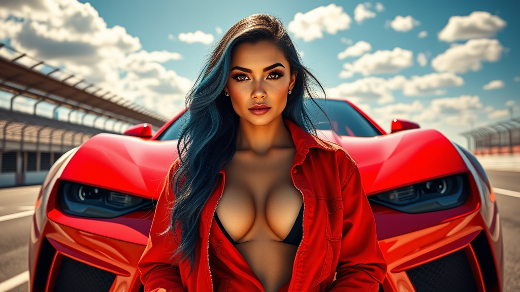 Modelshoot style, full body portrait of a stunning racecar woman standing confidently in front of a sleek red race car at the track, her tanned skin glowing under the sun. She has long hair, styled beautifully, and a face marked by harmony and detail, with a subtle, confident smirk. Her reflective eyes are highlighted by dark eyebrows and skillful makeup. The scene is enhanced by dust particles catching the light, with intricate, dramatic chiaroscuro lighting adding depth. She wears an open jacket that adds to her daring look, surrounded by the excitement of the race track, bleachers in the background, under a brilliant blue sky with scattered white clouds. Influences of John Constable, Ed Blinkey, Atey Ghailan, Jeremy Mann, Greg Manchess, and Antonio Moro bring an artistic flair, making the scene trendworthy on platforms like ArtStation and CGSociety. The entire image is rich in high detail and drama, reminiscent of Makoto Shinkai's Kyoto-inspired art, boasting a mix of vibrant colors and crafted textures. Her blue hair and the presence of headphones add a contemporary edge, while the overall composition feels polished and sophisticated, avoiding any flaws or distortions.