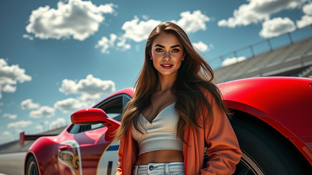 Modelshoot style, full body portrait of a stunning racecar woman standing beside a sleek red race car on a racetrack. She has a tanned complexion, long flowing hair, a symmetrical, smiling face, and reflective eyes with dark eyebrows accented by mascara and makeup. The scene is set beneath a blue sky dotted with white clouds, with bleachers in the background. Dust particles dance in the air as detailed lighting highlights her features with dramatic chiaroscuro. She wears an open jacket over a white outfit, exuding confidence and style. The image reflects influences from artists like John Constable, Ed Blinkey, Atey Ghailan, Jeremy Mann, Greg Manchess, and Antonio Moro, and is trending on ArtStation and CGSociety. The composition is intricate and high in detail, embodying the evocative and dynamic style reminiscent of Makoto Shinkai's work.