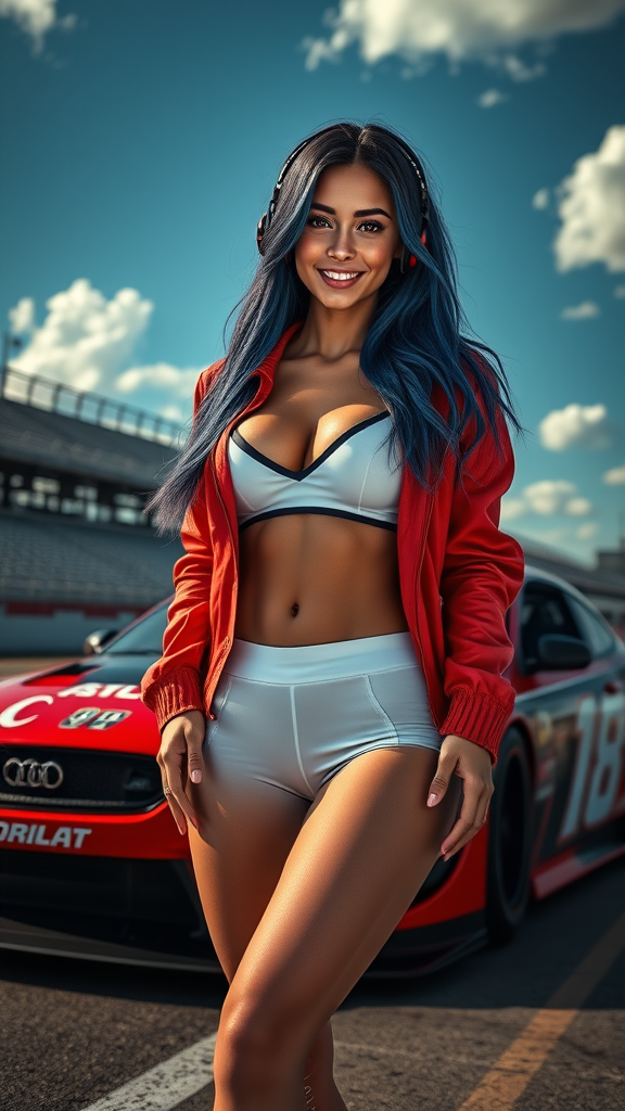 Modelshoot style, full body portrait of a stunning racecar woman standing beside a race car, tanned skin, long hair, detailed symmetrical face, bright smile, reflective eyes, dark eyebrows, mascara, makeup, dust particles, intricate lighting, rim lighting, dramatic lighting, chiaroscuro, open jacket, white yoga pants, on a race track with a red racecar with spoilers, set against a backdrop of bleachers, blue sky, and white clouds. Art inspired by John Constable, Ed Blinkey, Atey Ghailan, Jeremy Mann, Greg Manchess, Antonio Moro, trending art styles on ArtStation and CGSociety. High detail, dramatic scenery, with a touch of Makoto Shinkai’s style. The composition includes iron mouse-like blue hair and headphones, all captured in a canvas-like frame that avoids any imperfections such as extra limbs or poor anatomy, resulting in a highly polished and aesthetically pleasing image.