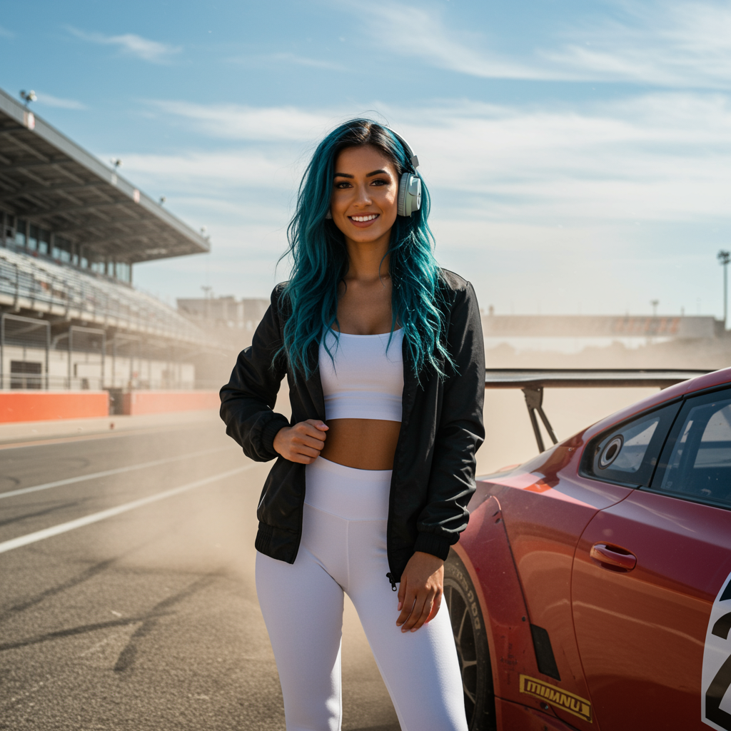 modelshoot style full body portrait of a stunning woman standing beside a race car; tanned skin, long hair, symmetrical face, bright smile, reflective eyes, dark eyebrows accented with mascara, subtle makeup; surrounded by dust particles with detailed, dramatic lighting including rim lighting and chiaroscuro; wearing an open jacket with white yoga pants, positioned on a race track beside a red racecar complete with spoilers; background includes road, bleachers, blue sky, and white clouds; inspired by the artistic styles of John Constable, Ed Blinkey, Atey Ghailan, and Jeremy Mann; capturing intricate and high-detail imagery with influences of Makoto Shinkai's Kyoto; adorned with blue hair and headphones, blending realism with a touch of whimsy; canvas frame effect with a hint of cartoon and 3D elements; achieving a balance of vivid colors and sharp focus, avoiding any distortions or unnatural proportions, making use of skilled artistry reminiscent of work trending on ArtStation and CGSociety.