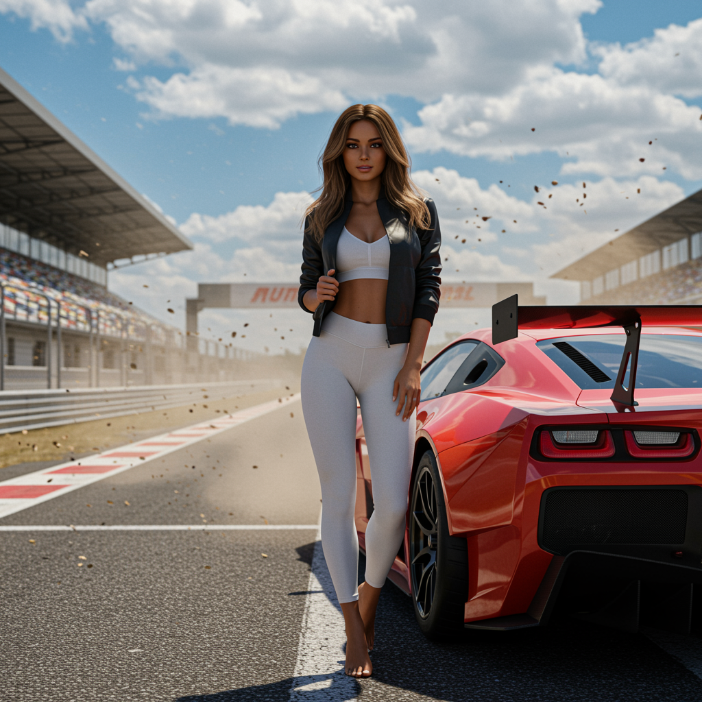 Modelshoot style full body portrait of a stunning racecar woman standing beside a race car. She has tanned skin, long flowing hair, and a detailed symmetrical face with a radiant smile. Her reflective eyes, dark eyebrows, and perfectly applied mascara enhance her makeup. Dust particles dance in the air, caught in the intricate lighting, which combines rim lighting, dramatic effects, and chiaroscuro. She wears an open jacket and white yoga pants, standing confidently on a race track beside a sleek red racecar with spoilers. The background features a road, bleachers, and a picturesque blue sky dotted with white clouds. The image draws inspiration from artists like John Constable, Ed Blinkey, Atey Ghailan, Jeremy Mann, Greg Manchess, and Antonio Moro, and is trending on ArtStation and CGSociety. The scene is intricate, high in detail, and dramatic, reminiscent of Makoto Shinkai's Kyoto style, with a touch of modern flair and artistry.