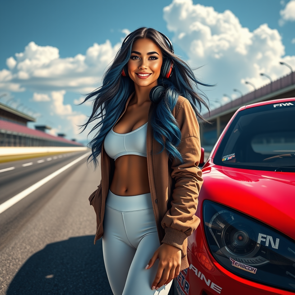 Modelshoot style, full body portrait of an exceptionally beautiful woman, a stunning racecar driver standing confidently beside a red racecar on a race track, with tanned skin and flowing long hair. Her face is detailed and symmetrical with a radiant smile, reflective eyes, dark eyebrows, and expertly applied makeup including mascara. Dust particles float in the detailed lighting, with rim lighting enhancing the dramatic chiaroscuro effect. She wears an open jacket and white yoga pants, set against a backdrop of road, bleachers, blue sky, and white clouds. Inspired by the artistic styles of John Constable, Ed Blinkey, Atey Ghailan, Jeremy Mann, Greg Manchess, and Antonio Moro, this scene trends on ArtStation and CGSociety for its intricacy and high detail. Elements of Makoto Shinkai's Kyoto influence the aesthetic, bringing an animated liveliness, while the character sports vibrant blue hair with an 'Iron Mouse' flair and wears headphones. Rendered with artistic finesse, avoiding any distortion or unrealistic proportions for a clear and captivating portrayal.