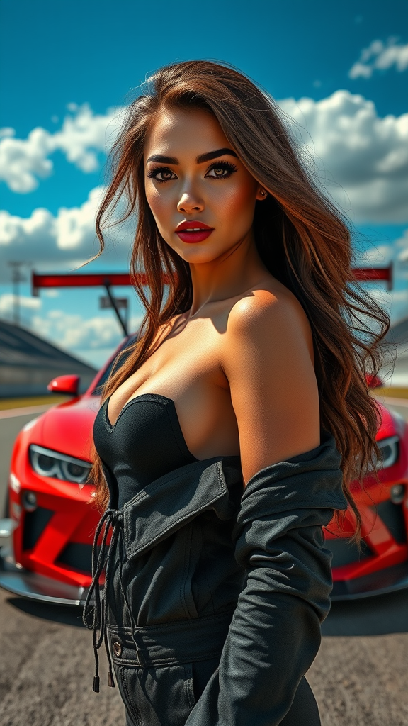 modelshoot style, full body portrait of the most beautiful woman in the world, beautiful racecar woman standing in front of a race car, tanned skin, long flowing hair, detailed symmetrical face, confident smirk, reflective eyes, bold dark eyebrows with mascara, subtle makeup, dust particles in the air, intricate detailed lighting with rim and dramatic chiaroscuro effects, open jacket, set on a race track with a striking red racecar featuring spoilers, surrounded by the road and bleachers under a vivid blue sky with white clouds, inspired by the artistic styles of John Constable, Ed Blinkey, Atey Ghailan, Jeremy Mann, Greg Manchess, Antonio Moro, trending on ArtStation and CGSociety, showcasing intricate high detail and drama akin to makoto shinkai kyoto, anime influences with vibrant, yet realistic colors.