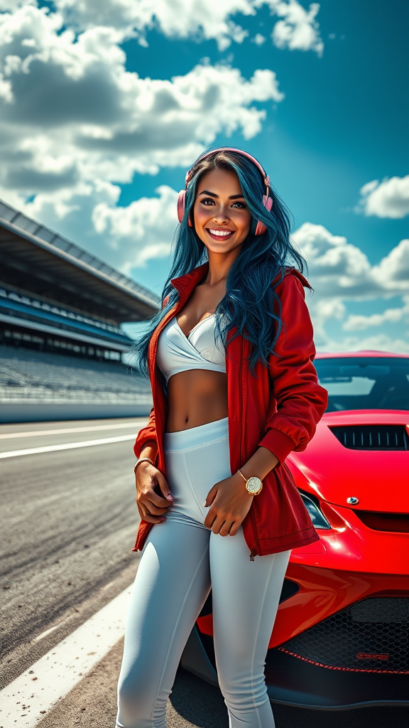 Modelshoot style full body portrait of the most beautiful woman in the world, a stunning racecar driver standing beside a sleek red race car on the race track. She has tanned skin and long flowing hair, with a detailed symmetrical face and a bright smile. Her reflective eyes shine under dramatic lighting, with dark eyebrows and well-applied mascara and makeup. She's wearing an open jacket and white yoga pants. Dust particles are visible, adding detail to the scene. Rim and chiaroscuro lighting create an intricate, high-detail atmosphere. The background features a blue sky with white clouds, bleachers, and the race track. The artistic style is reminiscent of the works of John Constable, Ed Blinkey, Atey Ghailan, Jeremy Mann, Greg Manchess, and Antonio Moro, trending on ArtStation and CGSociety. Her hair has a unique shade of blue, and she wears headphones, exuding a modern, anime-inspired vibe similar to Makoto Shinkai's style. The scene is vibrant and detailed, capturing the essence of a dynamic modelshoot on the racetrack.
