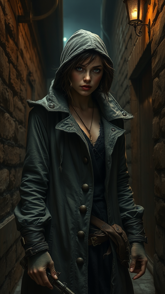 Modelshoot style, full shot body image of an exquisite artwork depicting a female medieval rugged thief, wearing a tattered coat, with an intense expression, set against the backdrop of a shadowy, grimy alleyway at night. The environment is gritty and uninviting. This masterpiece is rendered in a majestic oil painting style, evocative of works by Ed Blinkey, Atey Ghailan, Studio Ghibli, Jeremy Mann, Greg Manchess, and Antonio Moro. The scene is intricate, highly detailed, with sharp focus and dramatic elements, trending on ArtStation and CGSociety. It reflects a photorealistic quality blended with midjourney and Greg Rutkowski's cartoon influences. The artwork is presented without a watermark, signature, or out-of-frame elements, maintaining clear proportions and high resolution. A unique interpretation that avoids low resolution, unnecessary text, or disconnected limbs, while capturing the essence of a video game or 3D render without tiling effects.