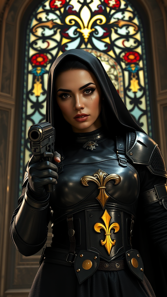 Modelshoot Style, full shot body photo of an exceptionally beautiful woman, a striking sister of battle wielding a bolt pistol, standing before an intricate stained glass window. She has tanned skin with a distinctive fleur de lys tattoo on her face and wax seals adorning her sci-fi nun armor. Her features include reflective eyes, dark eyebrows, and expertly applied makeup that enhances her symmetrical face. The setting is a grand space with marble walls and dust particles visible in the dramatic chiaroscuro lighting. This scene is reminiscent of a professional, majestic impressionist oil painting influenced by artists like Waterhouse, John Constable, and the imaginative worlds of Studio Ghibli. The detailed lighting and rim lighting highlight the intricate design, creating a majestic impression suitable for trending platforms like ArtStation and CGSociety. The artwork maintains high detail and dramatic flair, drawing inspiration from notable artists, leaving out any flaws or distortions, presenting a flawless composition with excellent anatomical accuracy.