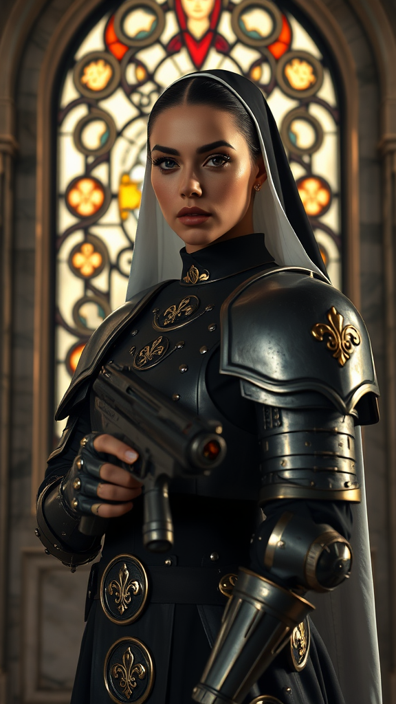 Modelshoot Style, full shot body photo of an extraordinarily beautiful woman, a striking sister of battle holding a bolt pistol standing against a stained glass backdrop, tanned complexion, fleur de lys face tattoo, wax seals adorning her armor, exquisite eyelashes, symmetrical face, reflective eyes, dark eyebrows, elegant makeup, attired in sci-fi nun armor, depicted in the Warhammer 40k aesthetic, surrounded by marble walls with dust motes dancing in detailed, dramatic chiaroscuro lighting. This scene reflects the majestic style of professional impressionism akin to works by Waterhouse, John Constable, Ed Blinkey, Atey Ghailan, Studio Ghibli, Jeremy Mann, Greg Manchess, and Antonio Moro. The artwork is trending on platforms like ArtStation and CGSociety, showcasing intricate, high detail with influences from Makoto Shinkai Kyoto.