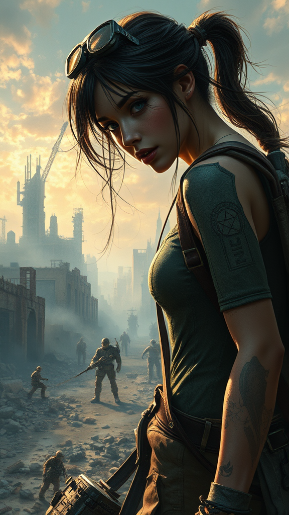Modelshoot style, full shot photo of a breathtaking artwork depicting a female post-apocalyptic survivor in a ruined cityscape, crafted as a professional oil painting. Inspired by Ed Blinkey, Atey Ghailan, Studio Ghibli, Jeremy Mann, Greg Manchess, and Antonio Moro, this piece trends on ArtStation and CGSociety. The artwork showcases intricate and highly detailed elements with sharp focus, embodying a dramatic, photorealistic quality. It features a compelling narrative perspective and displays artistic techniques reminiscent of Midjourney and Greg Rutkowski's style, with a touch of cartoonish flair. The image plays with unique, unconventional proportions to enhance its storytelling, creatively merging 3D elements to simulate a game-like environment without succumbing to low resolution or distractions like watermarks or signatures.