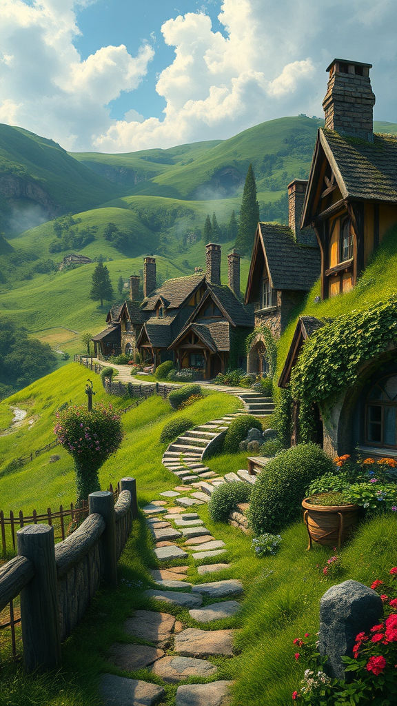 Modelshoot style image of a serene and beautiful hobbit's shire, a full body photo with the most exquisite artwork, inspired by majestic oil paintings by Ed Blinkey, Atey Ghailan, Studio Ghibli, Jeremy Mann, Greg Manchess, and Antonio Moro. This photorealistic painting art is intricate, high in detail, with sharp focus, dramatic flair, and crafted with the unique Style-SylvaMagic. Depicted in a canvas frame with a touch of cartoonish 3D rendering, this work trends on ArtStation and CGSociety. The scene captures the enchanting essence of a hobbit's world, presenting lush landscapes, quaint houses, and a peaceful ambiance. Set against rolling green hills and vibrant flora, the painting immerses viewers in an idyllic fantasy realm, akin to a storybook illustration. The Shire's captivating charm beckons all who behold this extraordinary blend of artistry and imagination.