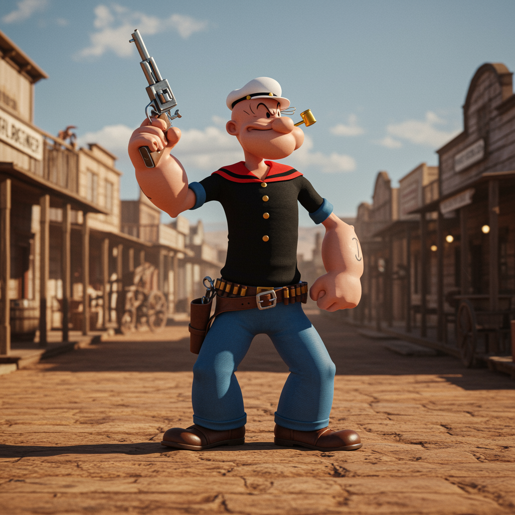 Modelshoot style, Popeye as a gunslinger in an old west main street, realistic masterpiece, highest quality, cinematic lens flare, created with unreal engine, digital painting, trending on ArtStation and CGSociety, intricate and high detail, dramatic realism, featuring beautiful and detailed lighting, vibrant and unusual colors, incorporating slight blurriness for motion effect, avoiding text or watermarks, and leaning away from black and white or cartoon styles.