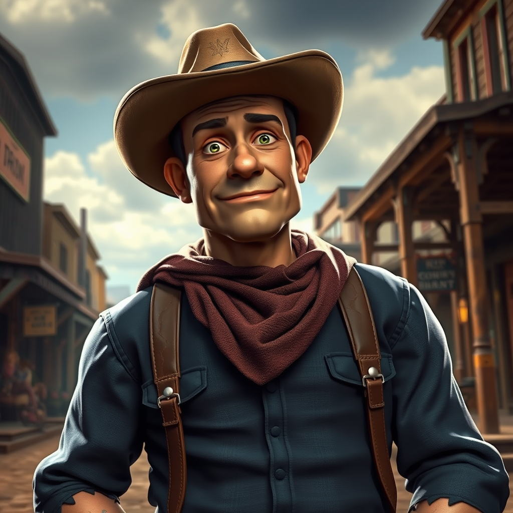 Modelshoot style, Popeye as a rugged cowboy in an old west main street, realistic masterpiece, highest quality with lens flare in an unreal engine environment, digital painting with intricate high detail, dramatic realism, beautiful and detailed lighting, trending on ArtStation and CGSociety, vibrant and unusual colors, softly rendered with atmospheric blur, artistic interpretation with no text or watermarks, capturing the essence without cartoonish elements.