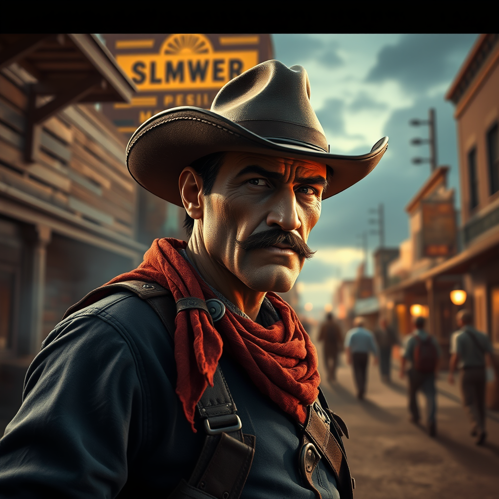 Modelshoot style, Popeye as a rugged cowboy on an old west main street, realistic masterpiece, highest quality with lens flare, digital painting created with unreal engine, trending on ArtStation and CGSociety, intricate details with dramatic realism, featuring beautiful and detailed lighting. The scene is alive with vibrant and unexpected colors, blending realism with surreal elements for a striking effect. Avoids blurriness, text, titles, watermarks, or black and white cartoonish elements, focusing on a vivid, high-detail composition.