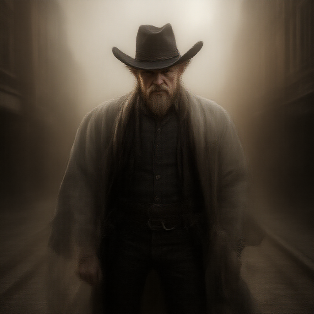 Modelshoot style, Popeye as a rugged cowboy on an old west main street, realistic and highly detailed masterpiece. A lens flare adds drama to the scene, crafted with the stunning capabilities of Unreal Engine. The digital painting is trending on ArtStation and CGSociety for its intricate, high-detail realism and beautiful lighting. The creative use of unusual colors enhances the dramatic atmosphere without any blurry elements. The piece omits any text, title, watermark, or cartoonish features, focusing instead on the captivating contrast and depth reminiscent of b&w photography while maintaining a vivid artistic palette.