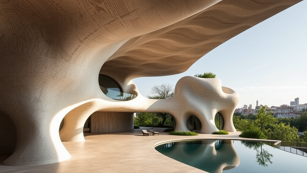 Modern architecture, drawing inspiration from Gaudi's organic forms, seamlessly blends with minimalist aesthetics; a fusion of fluid and geometrical lines with a contemporary flair, embracing nature with innovative, sustainable materials.