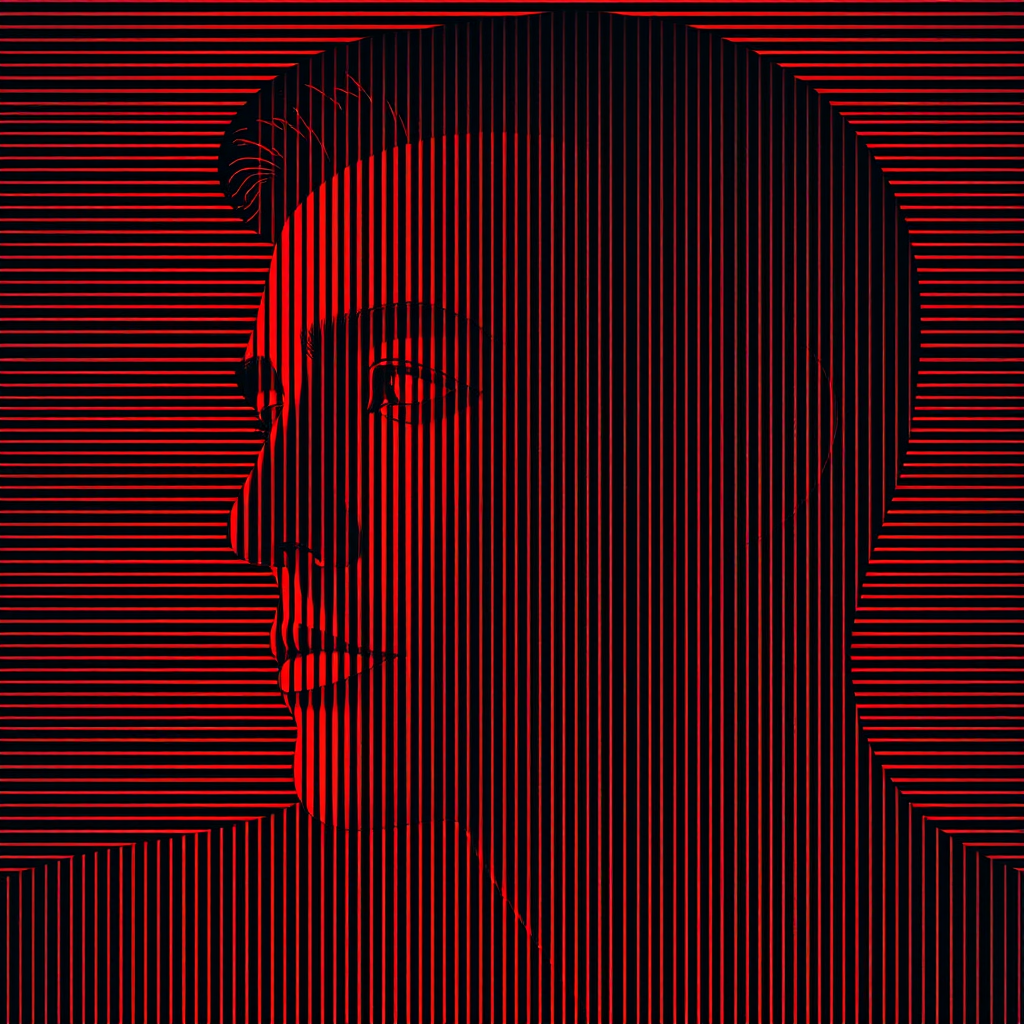 Modern art, man model face profile with minimalist overlay of stripes graphic design, focusing on tightly packed, alternating black and vibrant red lines to create an overhead, direct view of the artwork. Emphasis is on the pattern, capturing high contrast through strategic lighting to intensify the black and red colors. The lines are rendered with extreme precision, ensuring consistent widths and spacing to evoke a subtle moiré effect. The composition leverages high contrast settings to accentuate the interplay of light and shadow, maintaining the abstract aesthetic with slight creative variations, keeping the core concept visible --ar 9:16 --style raw.