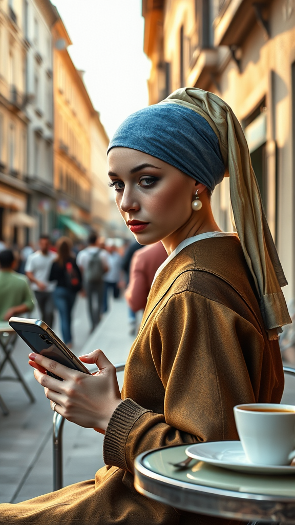 Modern digital photograph inspired by "Girl with a Pearl Earring," set in an Italian outdoor café. The girl, wearing a contemporary version of the iconic headscarf and earring, sits at a table with a cappuccino, gazing intently at her smartphone. The soft afternoon light casts a gentle glow, capturing a seamless blend of classic art and modern life, as bustling Italian streets form the vibrant backdrop.