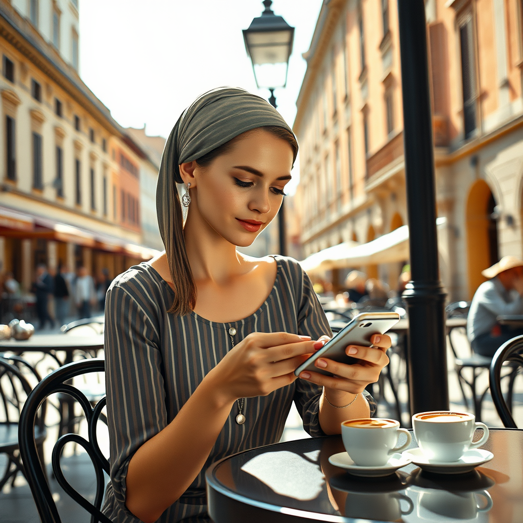 Modern digital photograph of a young woman reminiscent of "Girl with a Pearl Earring," set in a sunlit plaza in Italy, casually sitting at an outdoor cafe. She's engrossed in her smartphone, with a cappuccino on the table beside her, capturing a mix of timeless elegance and contemporary life, vibe-chill-76v-2202.