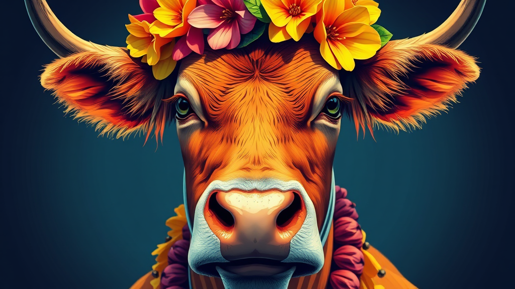 Modern Hawaiian-inspired portrait series of a nelore cattle adorned in vibrant attire, featuring an aggressive digital illustration style with bold shadows and airbrush techniques. The image showcases a close-up view, utilizing a pop art color palette for a striking effect, rendered in ultra HD with comic art influences.