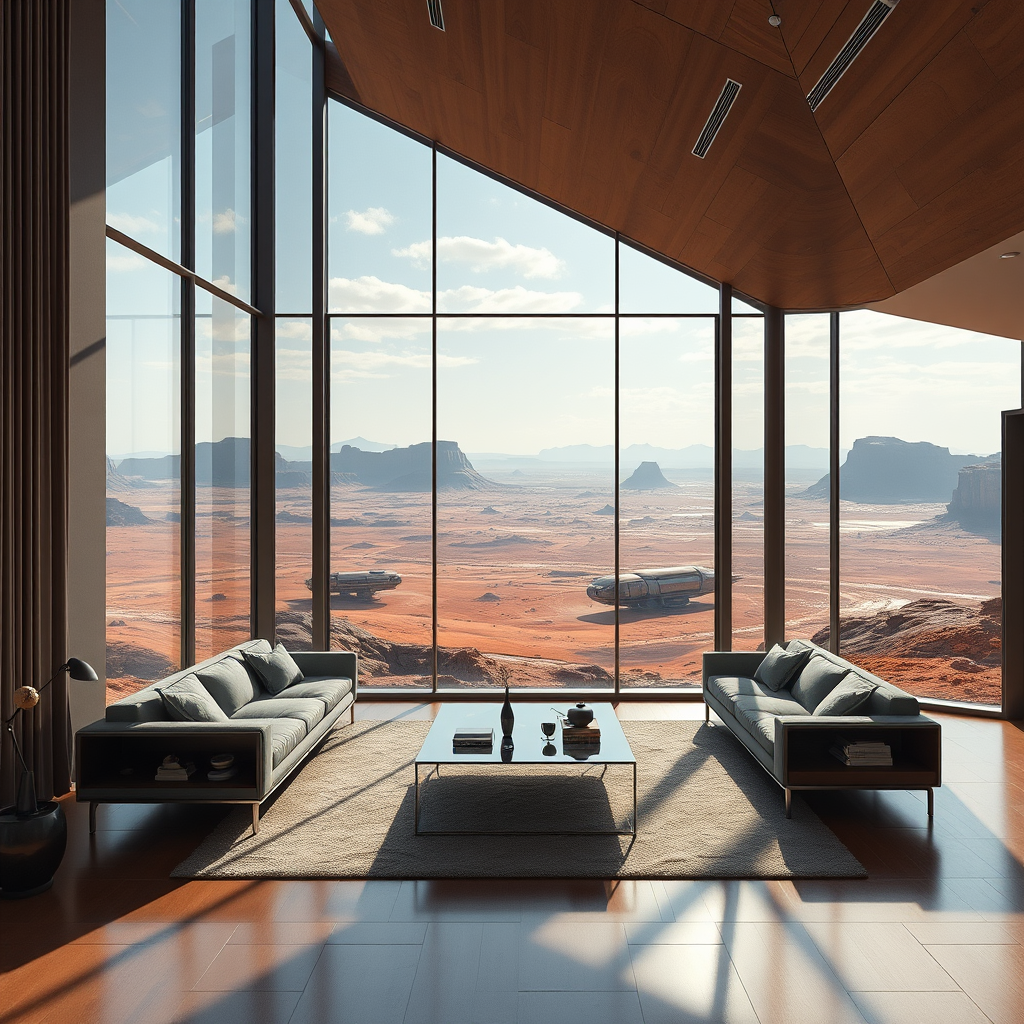 Modern living room with expansive windows showcasing a breathtaking view of the Martian landscape, fantasy elements infused with realism, digital art style merging photorealistic painting with imagination, extremely detailed CG work in unity, 8k wallpaper quality that blends high detail with artistic nuance, inspired by the styles of Midjourney and Greg Rutkowski, matte finish with a touch of Bryan Organ's influence, subtle negative space for ease.