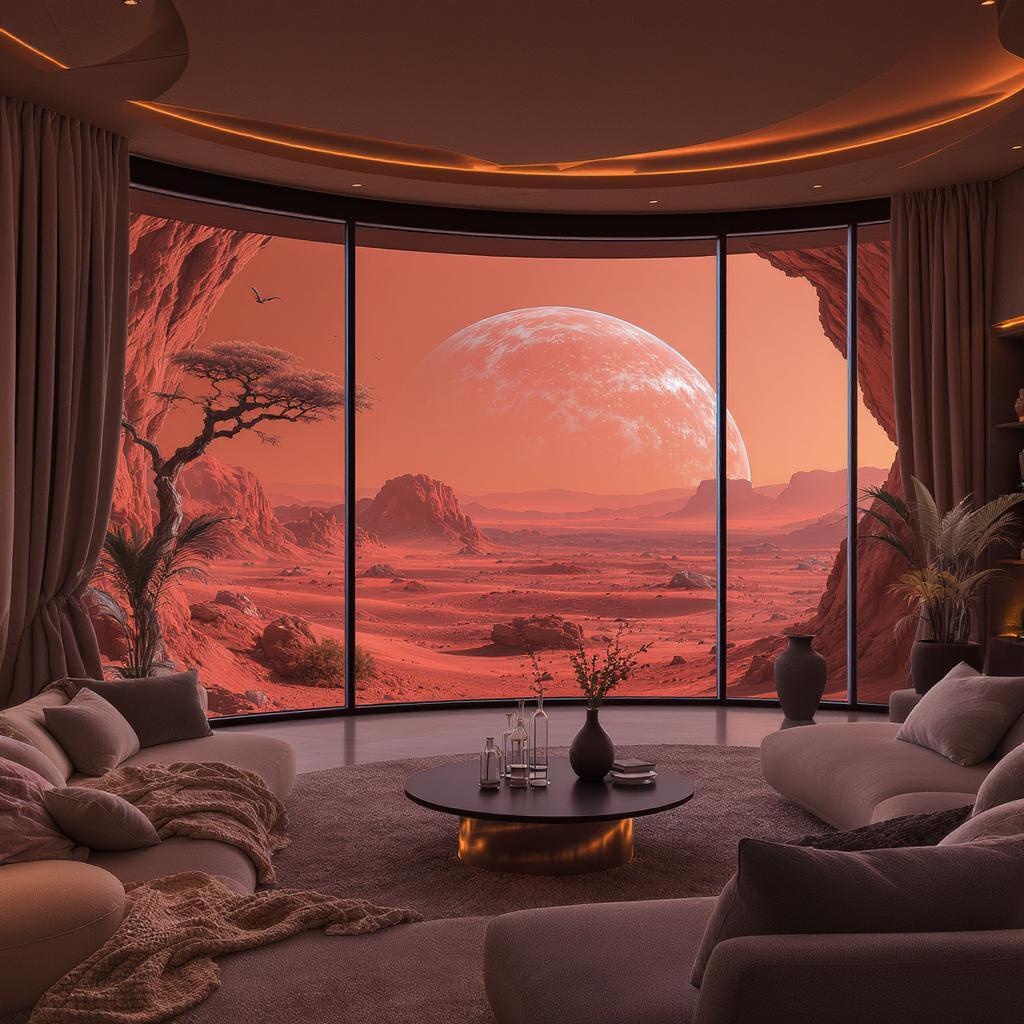 Modern living room with expansive windows showcasing a surreal view of the Martian surface, infused with fantasy elements, digital art style, extremely detailed CG unity 8k wallpaper, high detail, photorealistic painting inspired by Midjourney and Greg Rutkowski, matte finish with elements reminiscent of Bryan Organ's work, captivating and otherworldly atmosphere.