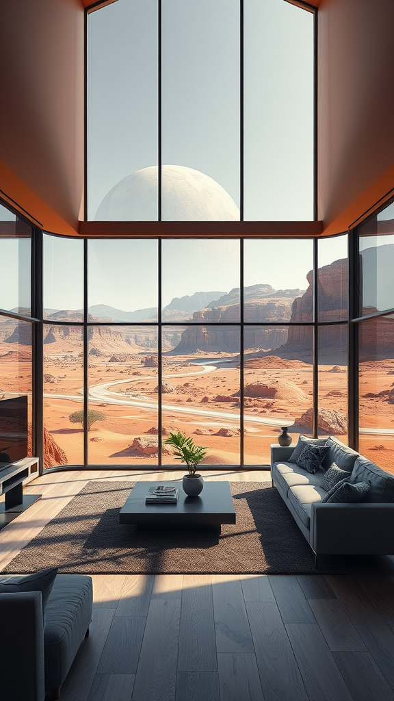 Modern living room with large windows showcasing a majestic view of the Martian landscape outside, fantasy elements intertwined, digital art, photo-realistic, superior quality, high resolution, meticulously detailed, ideal for a professional portfolio, inspired by Bryan Organ, matte finish, trending on ArtStation, in the style of Greg Rutkowski, by a talented artist, avoids any negative or inappropriate content.