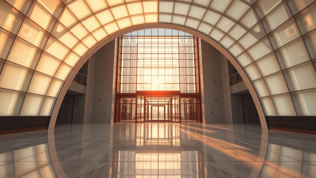 Modern minimalist, architectural photography, grand entryway with sweeping light panels creating an arch, symmetrical front-facing view, centered composition with depth-focused perspective, ultra-wide lens, low angle shot, golden hour glow, glossy marble floor with shimmering reflections, intense architectural lighting, grid-like glass panel design, modern urban environment, photorealism, intricate details.