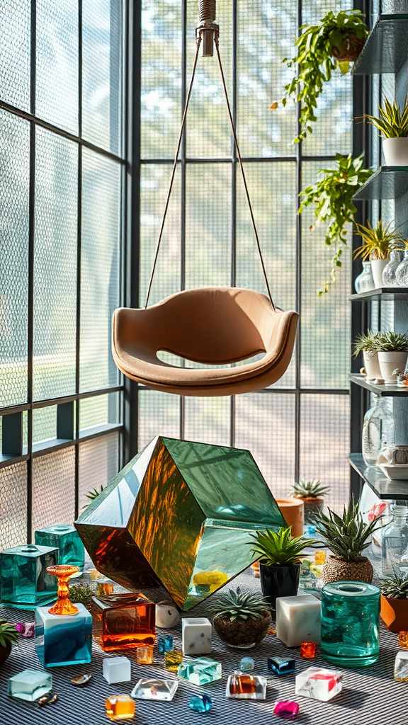 Modernist architectural chair suspended from steel pipe, lens-shaped desk sculpture with 90mm optical lens resting on it, steel mesh walls and floor, scattered with various types of colorful glass shards, glassware, and onyx cubes, soft-focus bokeh effect on surrounding glass panels, filtered natural light highlights on steel surfaces, greenery of succulents and air plants spilling over surrounding shelves, subtle scratches on glass and steel surfaces as a result of contact with previous users.