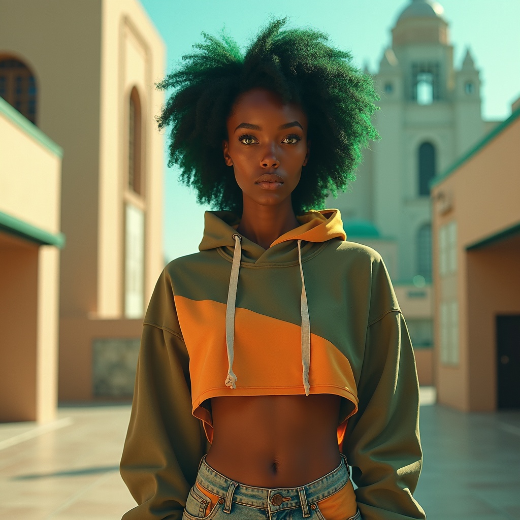 Modernist Constructivist fashion photo of a 24-year-old Anuak-Sinhalese female embodying boho chic beauty, her expression pensive with fragmented features. Her medium-tan skin with a hint of olive appears evenly bronzed from consistent sun exposure, skin pores and texture clearly visible and focused. Her eyes are soft, pale green, scalloped at the edges, framed by long, elegant eyelashes. She sports a geometric afro with precise, angular shaping, colored in revolutionary green. Her eyebrows are retro arch-shaped, enhancing her delicate facial features. Her physique includes strong, rounded shoulders forming a powerful silhouette, bigger breasts, and toned abs. She wears a cropped hoodie featuring graphic panels, midriff exposed, paired with slim-fit jeans displaying geometric color-blocking. Positioned with fragmented body rotation inspired by Cubo-Futurism on the left side of the frame by the rule of thirds, the background presents a civic plaza with towering geometric buildings. The scene is illuminated with geometric patterns of high-contrast color lighting, while the model is bathed in soft natural lighting reminiscent of Sergei Senkin.