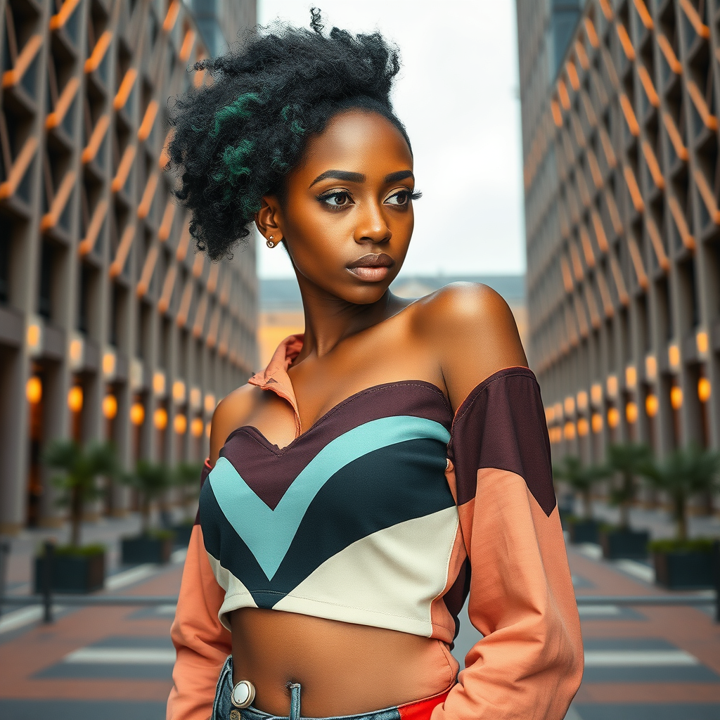Modernist Constructivist Fashion full body photo of a 24-year-old Anuak-Sinhalese female boho chic beauty with a pensive look and fragmented features expression. She has medium-tan skin with a hint of olive, evenly bronzed from regular sun exposure, with clearly visible skin pores and texture in focus. Her eyes are scalloped edged, soft pale green, framed by long, elegant eyelashes. Her haircut is a geometric afro with precise, angular shaping, dyed revolutionary green. Her eyebrows are retro arch-shaped, complementing her delicate facial features. She exhibits strong, rounded shoulders creating a powerful silhouette, accompanied by a bigger breast and toned abs. She wears a cropped hoodie with graphic panels exposing her midriff, complemented by slim-fit jeans with geometric color-blocking. Positioned with a fragmented body rotation inspired by Cubo-Futurism on the left side of the frame according to the rule of thirds. The background features a civic plaza with towering, geometric buildings, illuminated by geometric patterns with high-contrast color lighting, while the model is softly bathed in natural lighting in the style of Sergei Senkin.