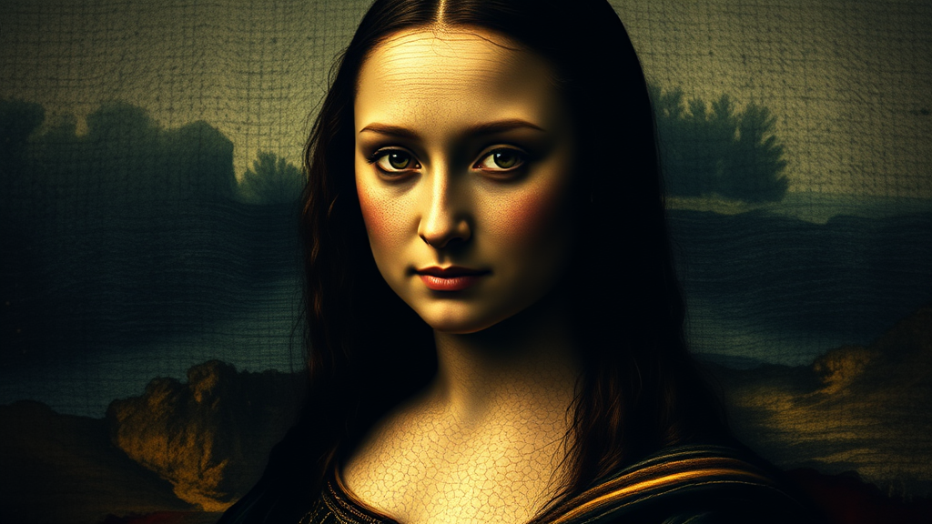 Mona Lisa reimagined as a gothic heroine, directed by Tim Burton, capturing a cinematic and realistic essence with intricate detail, intense gaze meeting the camera, infused with dark and gothic cinema influences, maintaining a 9:16 composition ratio, showcasing a moody and enigmatic atmosphere.