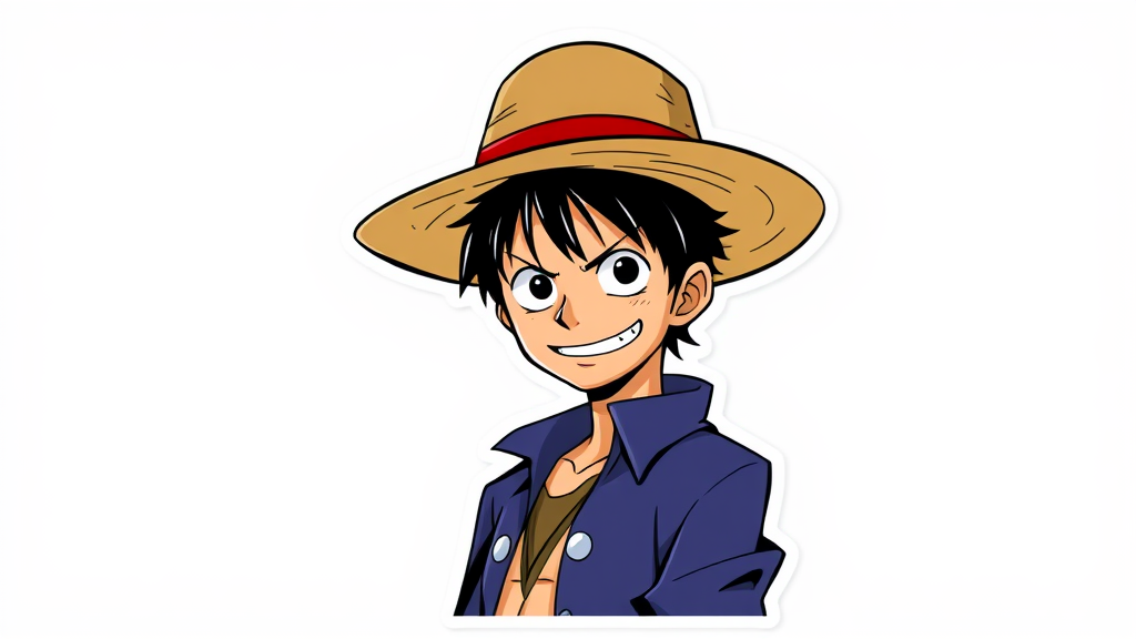 Monkey D Luffy anime style sticker simplified edges minimal color palette bold black lines chiseled jawline pursed lips mischievous smirk confident posture anchored by a wide straw hat plain background illustration art minimal texture
