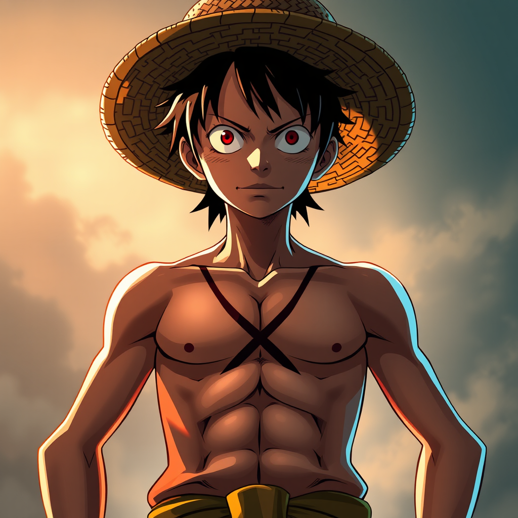 Monkey D. Luffy from One Piece anime, featuring an iconic X-shaped scar on his chest and his signature Straw Hat, with a symmetrical body in a dynamic portrait, enhanced by cinematic lighting and high contrast, inspired by artstation character concept art, presented in 8K resolution, captures the fiery determination in his eyes and the adventurous spirit embodied in his stance, subtle background elements that evoke the essence of the Grand Line.